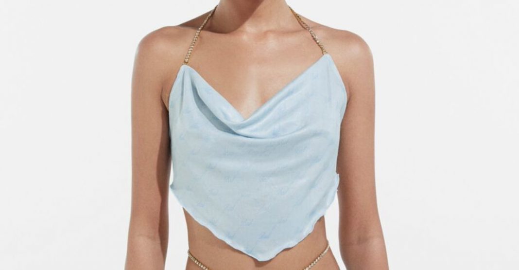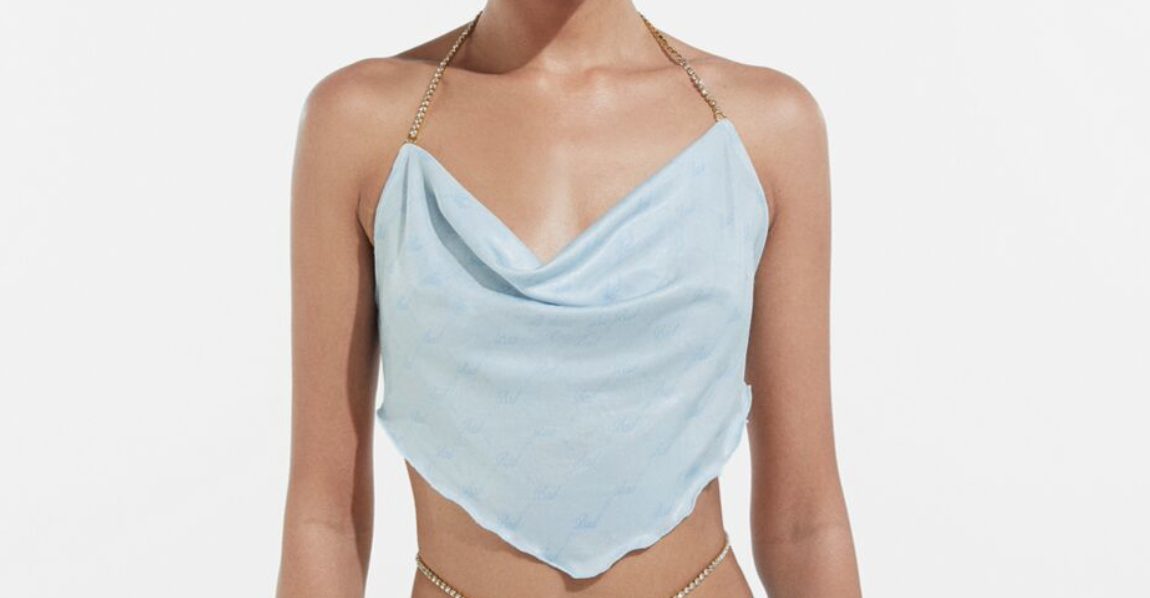 Teniendo en cuenta la temporada veraniega y haciendo uso de los tonos pastel saca prendas combinables en azul clarito. El top de escote con caída libre, se ajusta al cuello y a la espalda con cadenas plateadas incorporando el estilo joya a la prenda. El estampado del fondo es sutil pero se puede ver como se repite la palabra «Bad» haciendo alusión a la cantante. En la colección de Bershka participa su estilista personal aconsejando en los diseños, pero la última palabra es de Bad Gyal.
