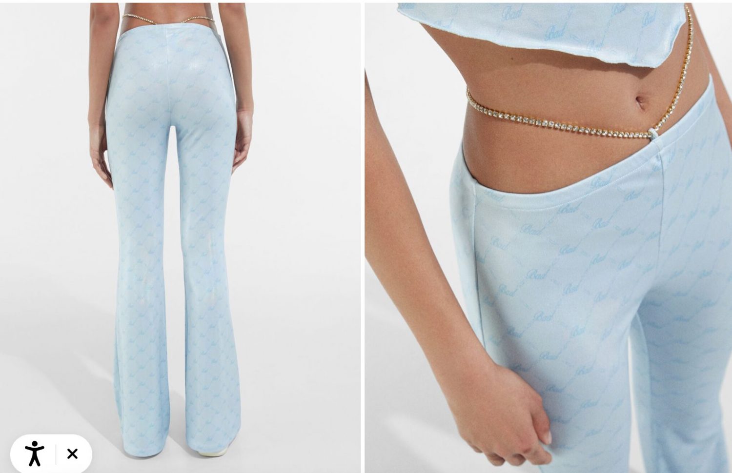 Puede combinarse a juego con el top que veíamos anteriormente consiguiendo un conjunto equilibrado y llamativo. Con un estilo campana, el pantalón es elástico y contiene una cadena para lucir en la cintura. Está fabricado con un 75% de poliéster obtenido a partir de plásticos reciclados, contribuyendo así al cuidado del planeta. Bad Gyal en su colaboración con Bershka ha diseñado los productos que mas se asemejan a su estilo, para poder vestir como ella a precios asequibles.