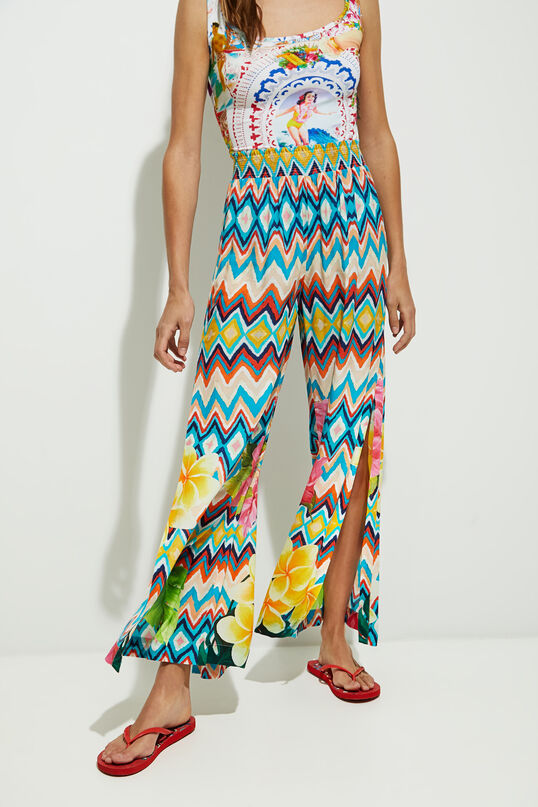 Otro de los pantalones anchos que están teniendo un gran protagonismo en la nueva colección de Desigual, son estos, de tejido fluido de viscosa, muy suave y agradable, con cintura elástica de tiro alto y una larga abertura lateral en la pierna que sube hasta encima de la rodilla. Tiene un bonito estampado de flores sobre geometría de intensos colores. Una prenda alegre y llamativa con la que causarás sensación. Tiene un precio de 59,95€.