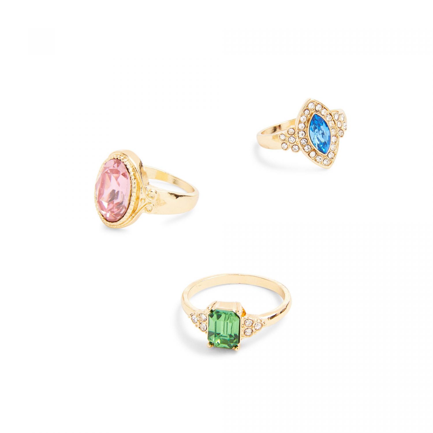 Vienen en un completo set de tres y cada uno tiene una piedra de un color distinto (rosa, verde y azul), todos ellos llamativos y veraniegos. Sus acabados dorados y con brillantes pondrán el broche final.