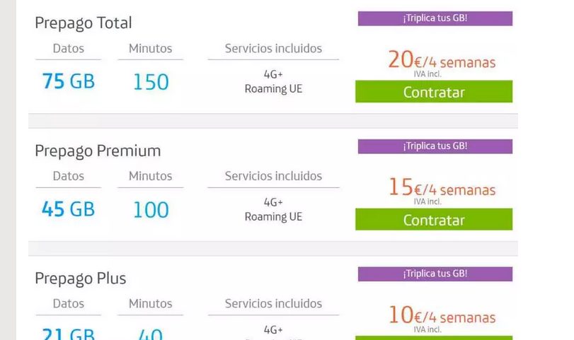 Con la promoción activa, los usuarios podrán elegir una tarifa con 40 minutos y 21 GB por 10 euros, 100 minutos y 45 GB por 15 euros, o 150 minutos y 75 GB por 20 euros. Es decir, incluirán el triple de gigas, sin necesidad de solicitarlo y sin coste, durante más de cuatro meses y medio.
