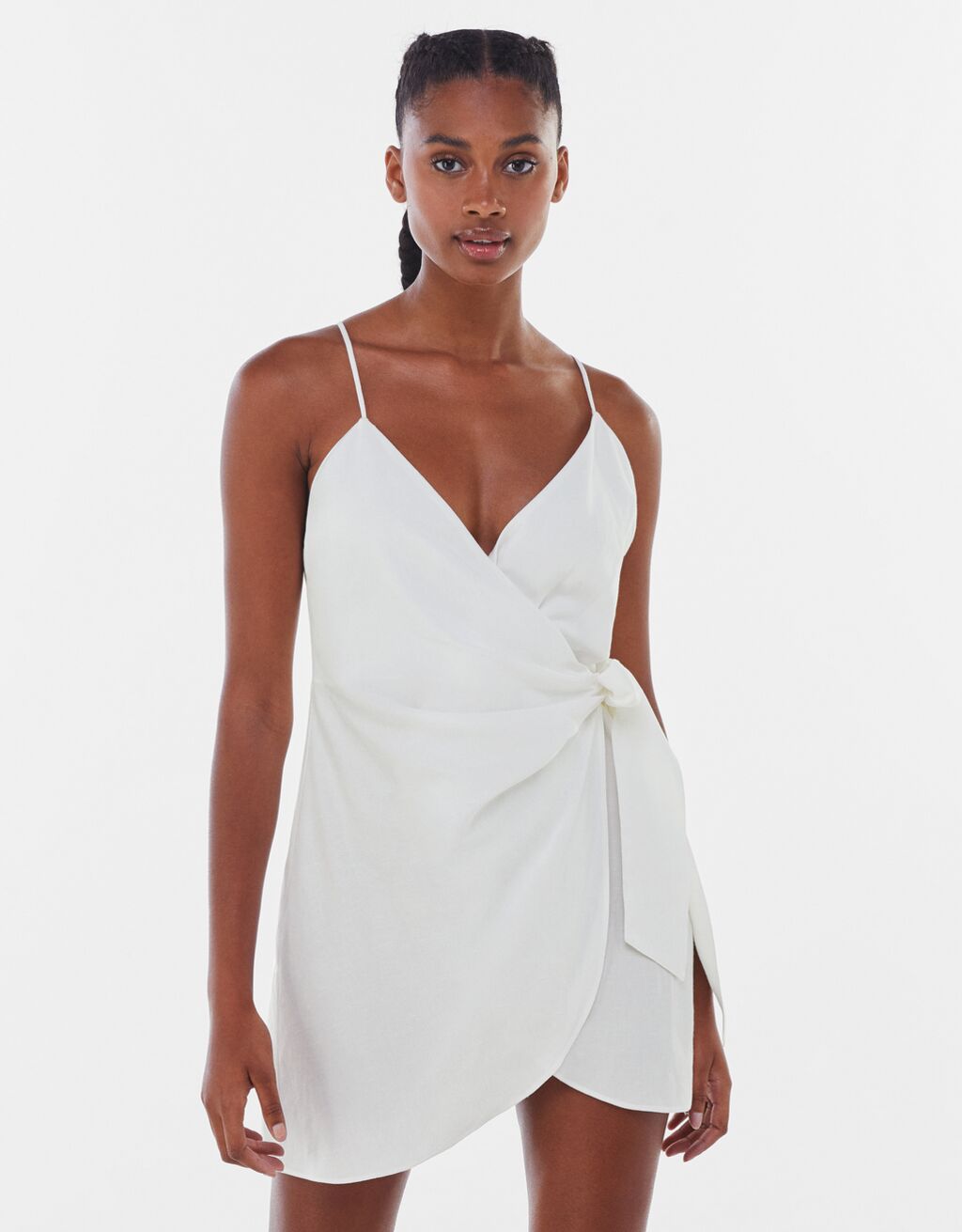 Seguimos haciendo un repaso a los vestidos más vendidos en el Bershka. Y este es uno de ellos porque es elegante, sencillo y al mismo tiempo barato. Para verano es un básico que no puede faltar en nuestro armario, se trata de un vestido corto en lino y que lleva un cruzado en la cintura.