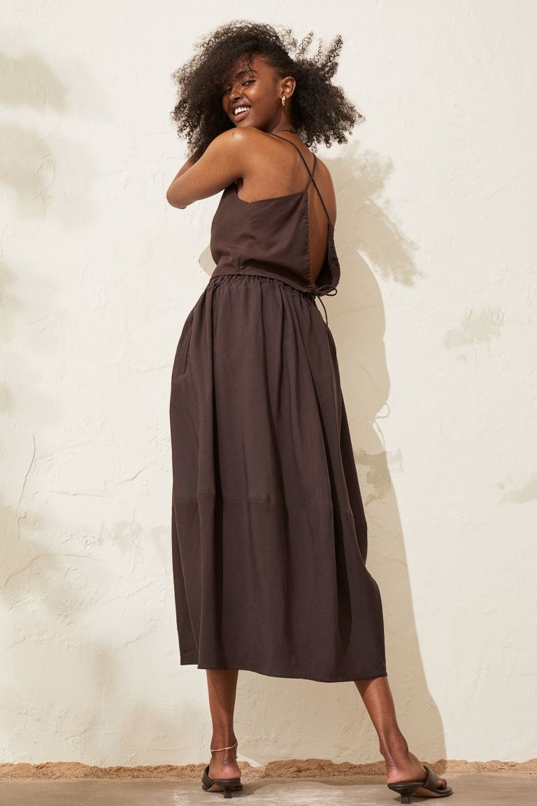 De corte midi y elaborada con mezcla de lino y lyocell, igual que el top, la conseguiremos también en un bonito color marrón oscuro muy favorecedor. Su fruncido en la cintura le aporta amplitud y conseguirá marcar la figura.