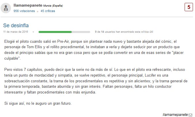 La mayoría de los espectadores confirman que Lucifer va de más a menos. “Vistos 7 capítulos, puedo decir que la serie no da más de sí. Lo que en el piloto era refrescante, incluso tenía un punto de mordacidad y simpatía, se vuelve repetitivo, el personaje principal, Lucifer es una sobreactuación constante”, explica LlamamePanete de Murcia.
