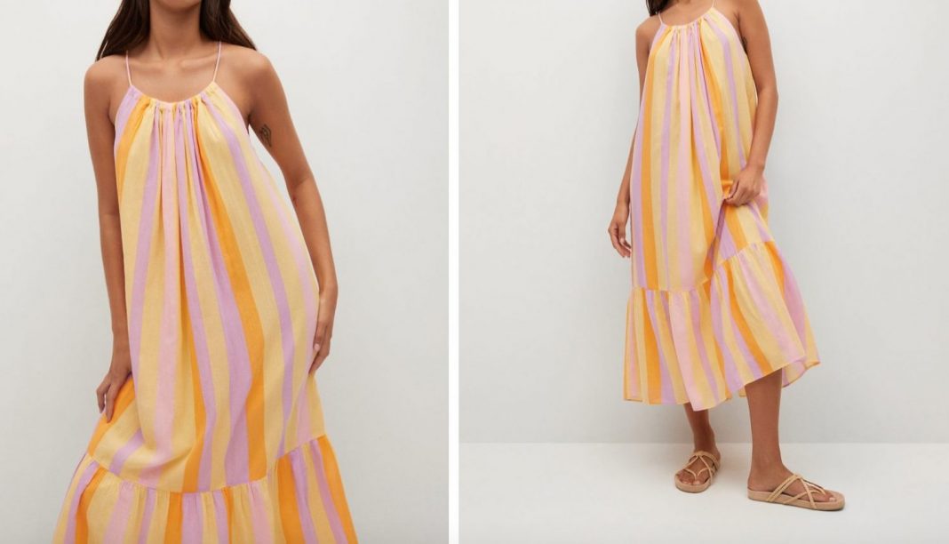 El vestido midi con estampado de rayas de Mango será de los más vendidos esta temporada. Es de tirante fino ajustable con fruncido redondeado al escote y a la espalda. Un vestido fluido que podrás lucir los días de más calor cómodamente. Sus colores vivos pastel en el diseño hacen de la prenda un gran atractivo para el consumidor. Mezcla el lila, el amarillo y el naranja entre las rayas verticales del vestido. Tiene un gran volante en la parte inferior del vestido que hace más especial su forma y un forro interior. Es de algodón 100% y se fabrica con materiales sostenibles por lo que pertenece a la colección Committed. Su precio es de tan solo 29,99 € por eso es probable que sea de los primeros en agotarse.