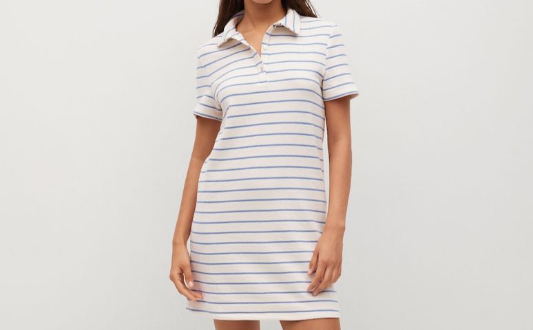 Un vestido corto de estilo marinero por su diseño estampado de rayas. El color de las rayas se aleja un poco del azul marinero clásico, ya que es más celeste. Está confeccionado con materiales sostenibles, como el algodón y el poliéster, formando parte de la colección Committed. Tiene manga corta y cuello clásico abotonado con apertura de pico. Presenta un tejido tipo toalla que además de estar de moda es muy adecuado para un día de playa. Una prenda muy cómoda y fresquita que podrás conseguir por solo 25,99 € en Mango.