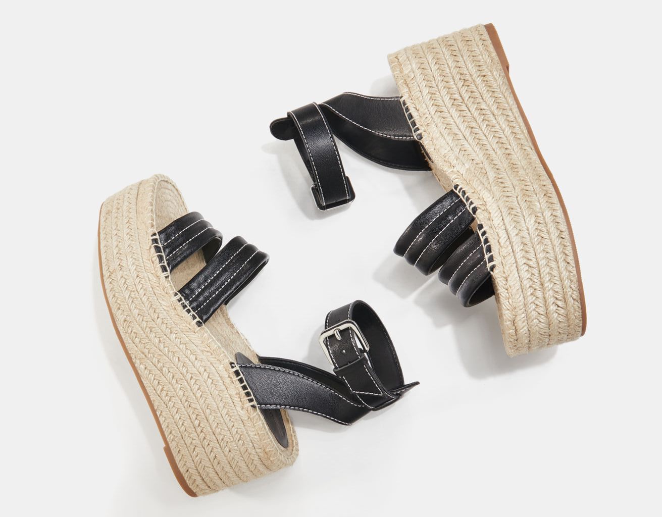 Las sandalias que no pueden faltar en tu armario este verano puedes encontrarlas en Bershka. Son muy cómodas por su plataforma y sus tiras se ajustan al pie. Su color negro combinado con el color del yute, una fibra sintética similar al esparto, da resultado a un básico veraniego. Tienen un pespunte en las tiras acolchadas como detalle que las diferencia del resto. La altura de la plataforma es de 8 cm y están disponibles de la talla 35 a la 41 de pie. Su precio especial ahora es de 19,99 € por lo que es probable que no tarden en agotarse.