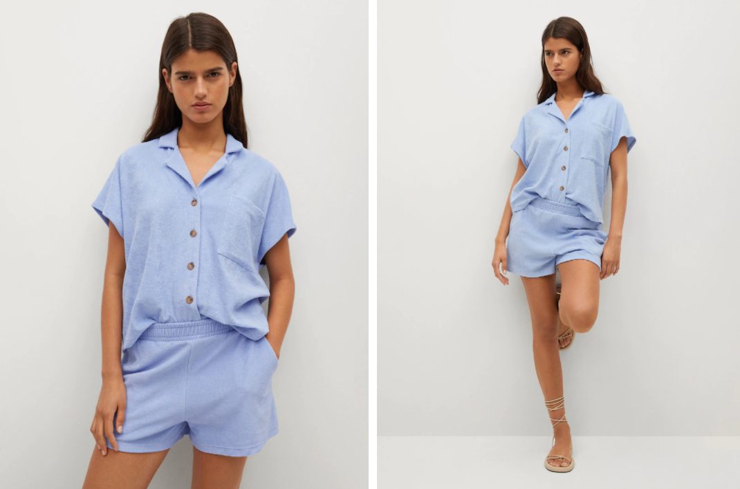 Este año, en Mango se han aficionado al tejido de toalla y nos hacen propuestas tan interesantes como este polo en un bonito tono azul. Con botones delanteros y cuello camisero, llamarás la atención allá donde vayas.
