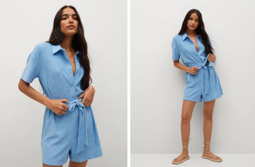 Si hay una propuesta que no vamos a poder rechazar por ser una de las más originales que podemos encontrar en Mango es este bonito mono azul fuerte en tejido de toalla.