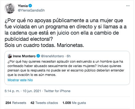 La de Benidorm respondía, por el mismo medio, a la ministra diciéndole: «¿Por qué no apoyas públicamente a una mujer que fue violada en un programa en directo y sí llamas a la cadena que está en juicio con ella a cambio de publicidad electoral? Sois un cuadro todas. Marionetas».