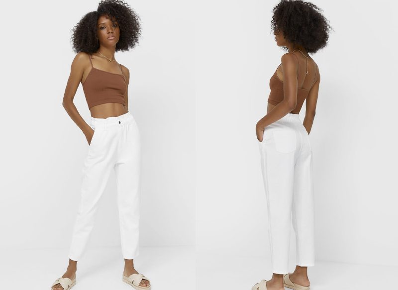 Son unos jeans de sarga de tiro alto con cintura elástica tipo paperbag, con bolsillos delanteros y bajo acabado en vuelta. Tiene un cierre frontal con cremallera y botones metálicos.