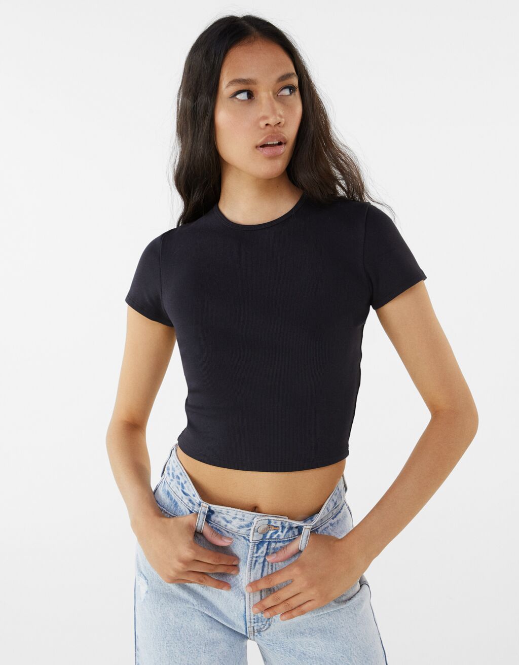 Deseas algo cómodo, que mantenga tu cuerpo fresco en las altas temperaturas veraniegas, ven y búscalo en las tiendas Bershka. Tienen para este verano la camiseta rib manga corta, con su cuello redondo y se amolda 100% a tu figura. Confeccionada en 98% de algodón y 2% de elastano y en unos colores indescriptibles: Arena, azul claro, rojo, blanco y negro. Vienen en todas las tallas desde la XS hasta la XL, con su mínimo precio podrás llevártelas todas, cada una a tan solo 5.99 euros.