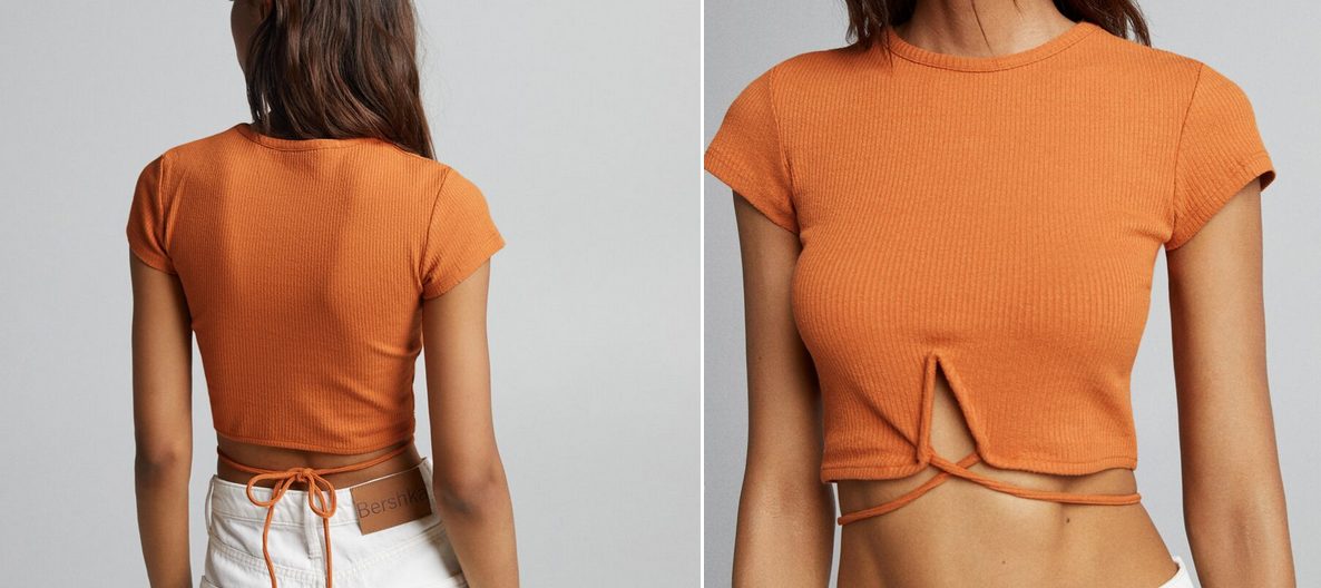 Seguimos con las camisetas, pero en este caso, le ponemos manga corta y un toque muy original. Como puedes ver en este modelo de Bershka es una camiseta con un corte cut en la zona del ombligo que la hace perfecta para lucir tipazo durante estas próximas semanas.