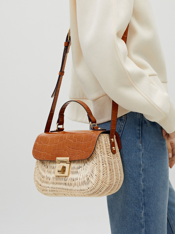 Iniciamos a describir las rebajas idéales para el verano que trae Parfois para la mujer de hoy, con este bolso bandolera trenzado combinado, con grabado animal, asa de mano superior y el asa bandolera es ajustable, con cierre de solapa metálico.