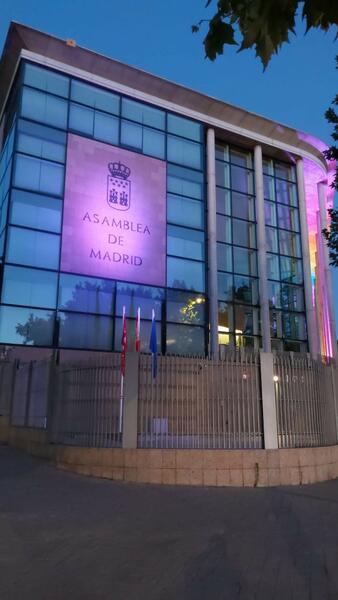 El edificio de la Asamblea de Madrid se iluminó ayer por la noche con los colores arcoíris con motivo de la celebración de la semana del Orgullo LGTBI, tal y como solicitó el PSOE y aprobó la Mesa de la Cámara regional.