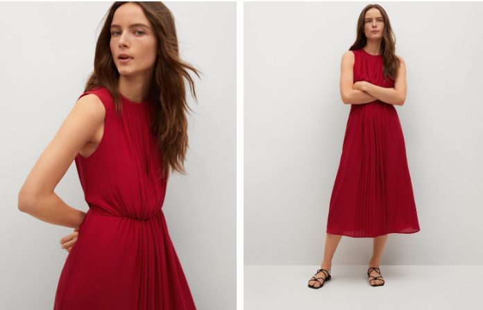 El vestido detalles plisados que trae Mango en la promoción de rebajas, es un vestido de tejido fluido, con un diseño acampanado, posee su cuello cerrado, para mayor comodidad y frescura viene sin mangas y con exclusivos detalles plisados.