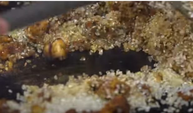 Luego echamos el tomate, y comienza a ser algo bestial. El tomate se seca y se tuesta. Y ahora es el momento del sexto ingrediente: el azafrán. Se lo tiras a un lado de la paella, y justo antes de que se queme, lo mezclas con el resto de los ingredientes.