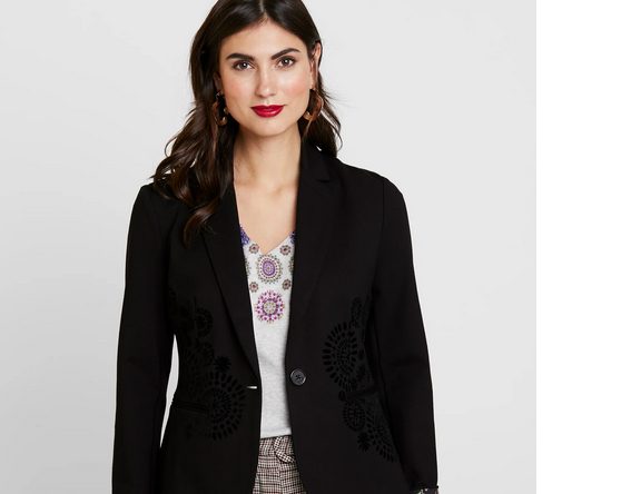 Un blazer es un clásico que siempre tiene que estar en nuestro armario. Sobre todos si tenemos que acudir a la oficina, porque es ideal para no pasar frío pero tampoco calor. En este caso en Zalondo puedes encontrar este modelo outlet con un 50% de descuento de la marca Desigual. A un precio de solo 35 euros. Está fabrica den 70% viscosa, 26% poliamida, 4% elastano y el relleno: 100% poliéster. Lo único que tienes que recordar no utilizar secadora y lavar a máquina a 30°C, en programa delicado.