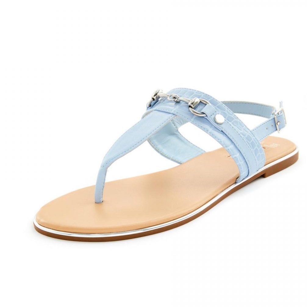 Este modelo de sandalia plana está disponible en 3 colores. Las azul clarito son las más llamativas y originales pero también más limitadas en las combinaciones. Los otros colores disponibles son el negro entero, incluyendo la plantilla con detalles metálicos en dorado, y el camel completo, con detalles metálicos en plateado. En su diseño también se incluye en el lateral de la suela una fina línea metálica. Se ajustan al tobillo con una tira de hebilla regulable. Cuestan 8€ y puedes encontrarlas en cualquier tienda de Primark.
