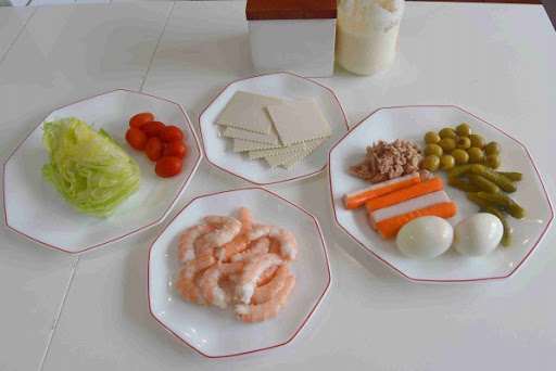 Lo primero es lo primero, y en este caso son los ingredientes para poder hacer una estupenda lasaña fría. En este caso, vamos a necesitar las láminas de lasaña pre-cocidas, una docena de Palitos de cangrejo o Surimi, 200 gramos de gambas cocidas y pelada, un bote de aceitunas rellenas de anchoa.