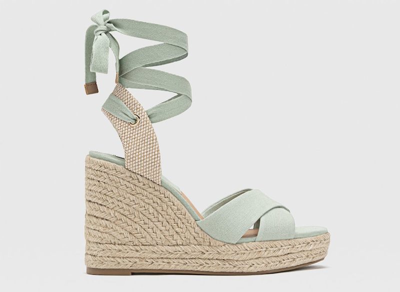 Entre las ofertas en calzado de Stradivarius hay que hacer mención especial a estas cuñas yute atadas, un modelo perfecto para lucir durante este verano. Se trata de unas cuñas verdes de yute que poseen un cierre mediante tiras atadas al tobillo y que tiene una altura de tacón de 11 cm.