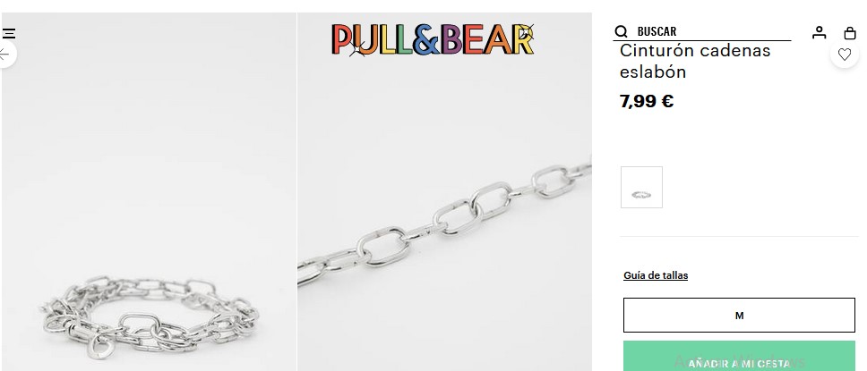 Es uno de los hermosos cinturones más vendidos por la web, y uno de los preferidos por las mujeres. Se caracteriza por ser un cinturón metalizado tipo cadena con eslabones, espectacular para esas mujeres que les encanta estar a la moda y marcando tendencia. Son fabricados en 95% hierro y 5% zinc, por lo que no se debe lavar, no usar lejía ni blanqueador. Inclusive, no planchar, no limpieza en seco y menos debemos usar secadora. Pueden comprar este hermoso cinturón por Pull&Bear a un precio de 7,99 €.