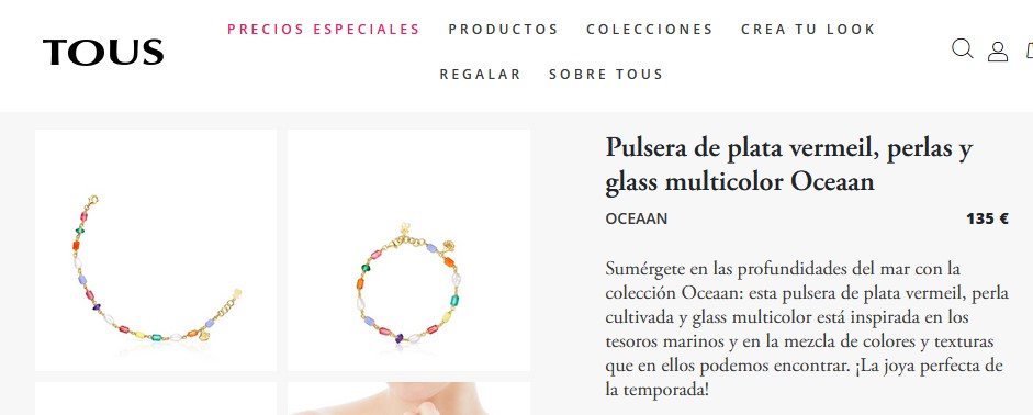 Esta hermosa pulsera elaborada de plata vermeil, con perlas cultivadas y glass multicolor está completamente inspirada en los tesoros marinos. Por lo que, se ha convertido en una de las joyas más vendidas por la plataforma de Tous. Se caracteriza por estar compuesta de una mezcla de colores y texturas, que en ellas se puede encontrar, además es una de las joyas perfectas de esta temporada. Es hermosa dado que cuenta con un diseño y estilo único en su categoría, ya que tiene unas piedras de colores en todo el alrededor. Así que, anímate a comprar esta hermosa pulsera Tous a un precio accesible de 135 €.
