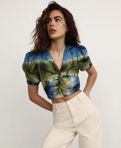 La marca Fórmula Joven se hace eco de las tendencias más juveniles con esta llamativa blusa con corte crop, y un veraniego estampado tie dye. Además cuenta con una bonita manga francesa abollonada y un original escote en forma de pico con efecto nudo. Está fabricada con un 97% de algodón y 3% de elastano que hace que se adapte maravillosamente a la silueta.Se convertirá en un imprescindible en tus looks más veraniegos. Combínala con shorts, vaqueros o faldas vaporosas. Ahora tiene un descuento increíble del 60% y el precio se queda en 15,99€. Puedes comprarla aquí.