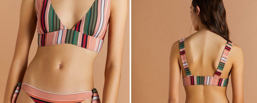 Este pop de bikini a rayas con tirante ancho nos gusta mucho por su originalidad. Primero nos gusta la combinación de colores, que es llamativo y al mismo tiempo muy estiloso. Segundo porque ese tirante ancho le da un toque diferente al típico bañador. Y además si lo combinas con la braguita se convierte en una combinación perfecta. Y lo que más nos gusta es su precio: 11,99 euros. Un modelo perfecto para bañistas jóvenes y menudas porque hace resaltar la figura.