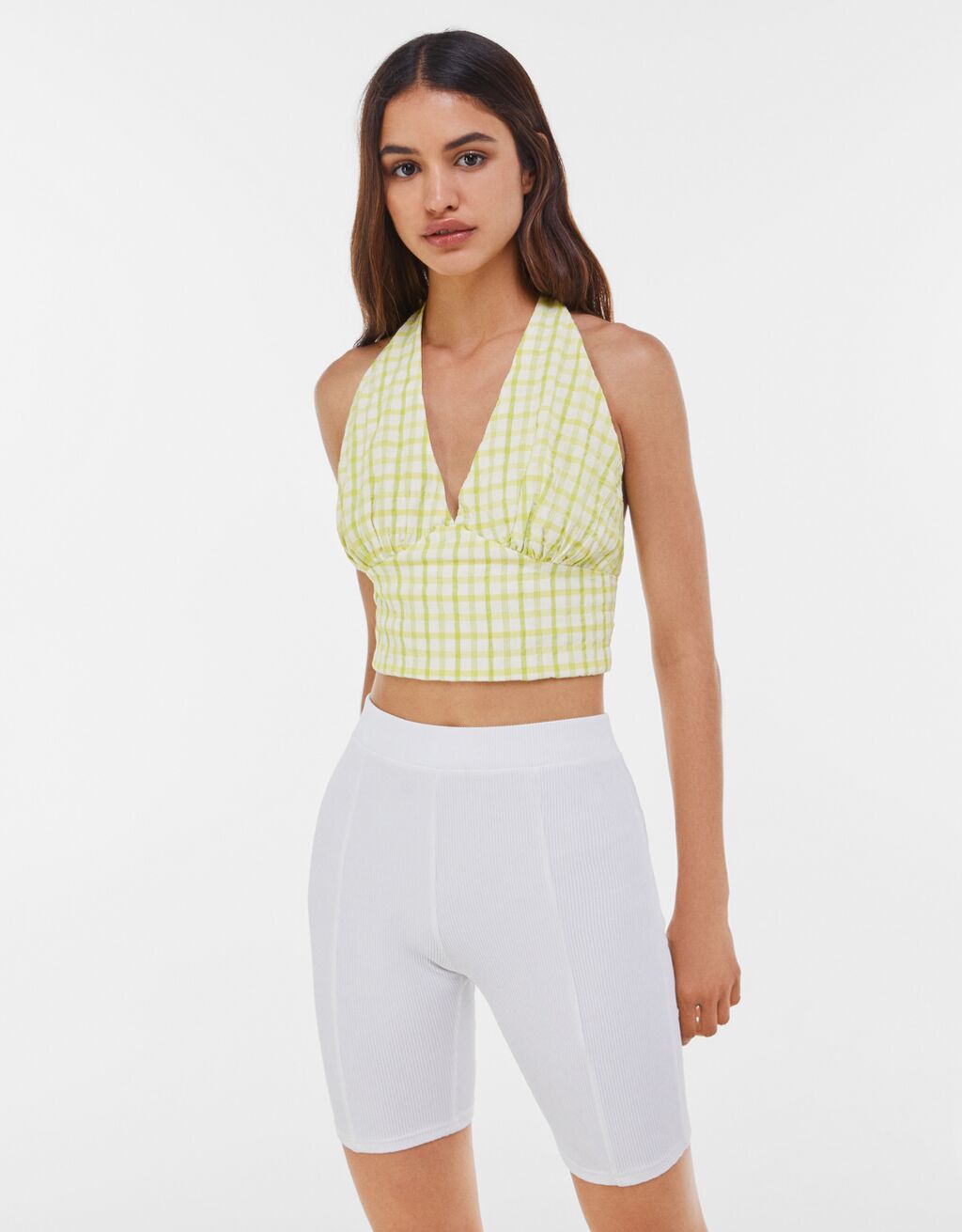 Los cuadros vichy son el claro ejemplo de que en verano podemos seguir yendo a la última moda con estampados divertidos y de colores alegres. Así nos lo muestra Bershka a través de este favorecedor top con tirantes al cuello.