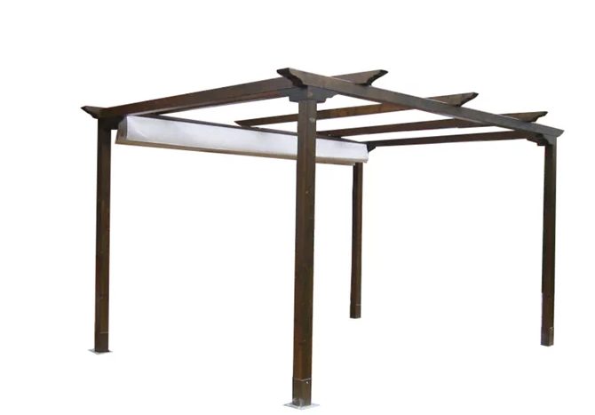 Una buena opción es esta pérgola Rodas fabricada en madera de abeto en color nogal intenso, indicada para cubrir una superficie de 9 m2. Ofrece una alta resistencia a los rayos UV y al agua. Incluye toldo plegable en color beige para protegerte de los rayos de sol y las inclemencias meteorológicas. Ideal para disfrutar de tus ratos de ocio en el jardín o terraza, y por supuesto, para estar debajo en una hamaca y disfrutar de una siesta de esas que se cae la baba. Su precio es de 1.209 euros.