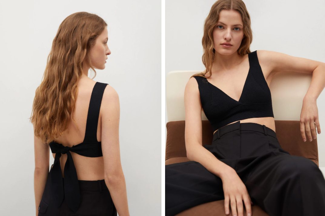 Uno de los básicos imprescindibles que encontramos en la nueva sección de punto de Mango es este top negro muy original. Su detalle principal lo vemos justo en la parte posterior, coronado con un lazo muy sensual.