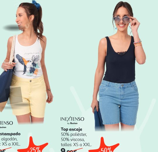 Durante estos días previos al verano te hemos mostrado un montón de tops para poder tener de quita y pon. Sin embargo, ninguno de ellos tenían estos precios que nos ofrecen Alcampo. Por ejemplo un top estampado en 100% algodón de las tallas XS hasta la XXL por solo 2,95 euros. ¿Cómo te quedas? U otro top de encaje por solo 4,99 después de estar rebajado con más de un 50% de descuento.