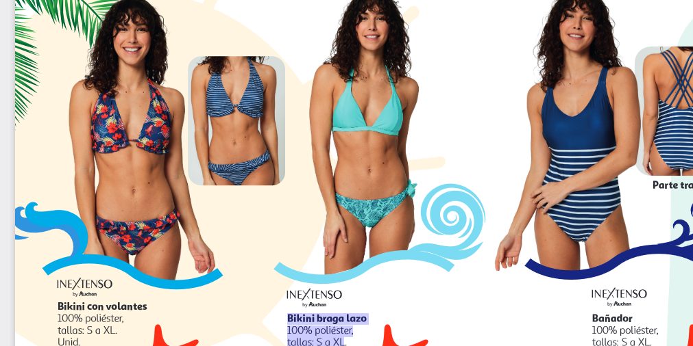 Estamos en verano y ahora mismo lo más importante es lucir tipazo (o intentarlo) en la playa y en las piscinas, y para eso tenemos que lucir los bikinis más chulos. Alcampo nos ofrece la posibilidad de hacerlo y a un precio muy económico. En este caso tenemos un bikini con volantes 100% poliéster de las tallas: S a XL por solo 7.99 euros. Y porel mismo precio, con un descuento del 40%, un bikini braga lazo. Modelos que no tienen nada que envidiar a los de las grandes marcas que aquí te hemos mostrado.