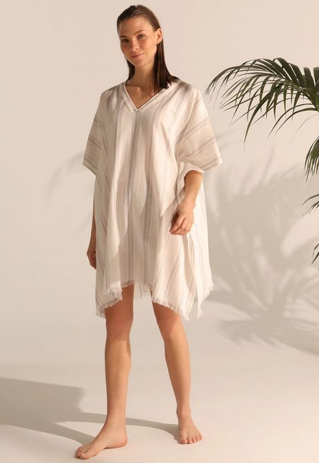 El caftán es una de esas prendas emblemáticas del verano que no pueden faltar en tu armario, y menos en tus escapadas a la playa. Es un tipo de prenda muy característico, con un diseño suelto y muy cómodo. Este modelo de El Corte Inglés es corto, con un cuello de pico muy confortable, y con rayas en tonos blanco y beige. Es de algodón, con detalles metalizados que le dan un punto de elegancia. Tiene un 36% de descuento así que ahora cuesta 23 €, y lo puedes comprar directamente en la web.