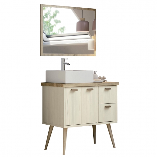 Donde se le puede dar un cambio radical a un hogar es en los muebles del baño. Incluye mueble, espejo y lavabo cerámico y sus medidas de mueble son 93x82x46 cm y con un espejo 60x81x1,8 cm, color pino-cambrian, tapa de 3 cm de grosor, patas de haya, guias metálicas, balda interior regulable en altura con tip mobiliario y Otros Accesorios de Baño. No te preocupes porque incluye piezas para el montaje, la tornillería, herrajes necesarios e instrucciones, El precio es de 194 euros, después de tener una rebaja de casi el 30%.