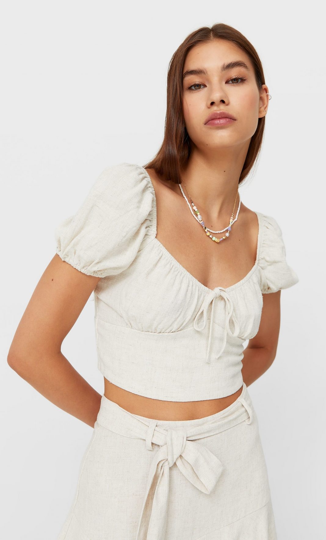 Iniciamos este desfile de top de Stradivarius, con el top manga corta rústico, con escote pico y mangas cortas abullonadas. Un delicado detalle elástico en su parte trasera, que moldeara en forma perfecta tu delicada espalda.