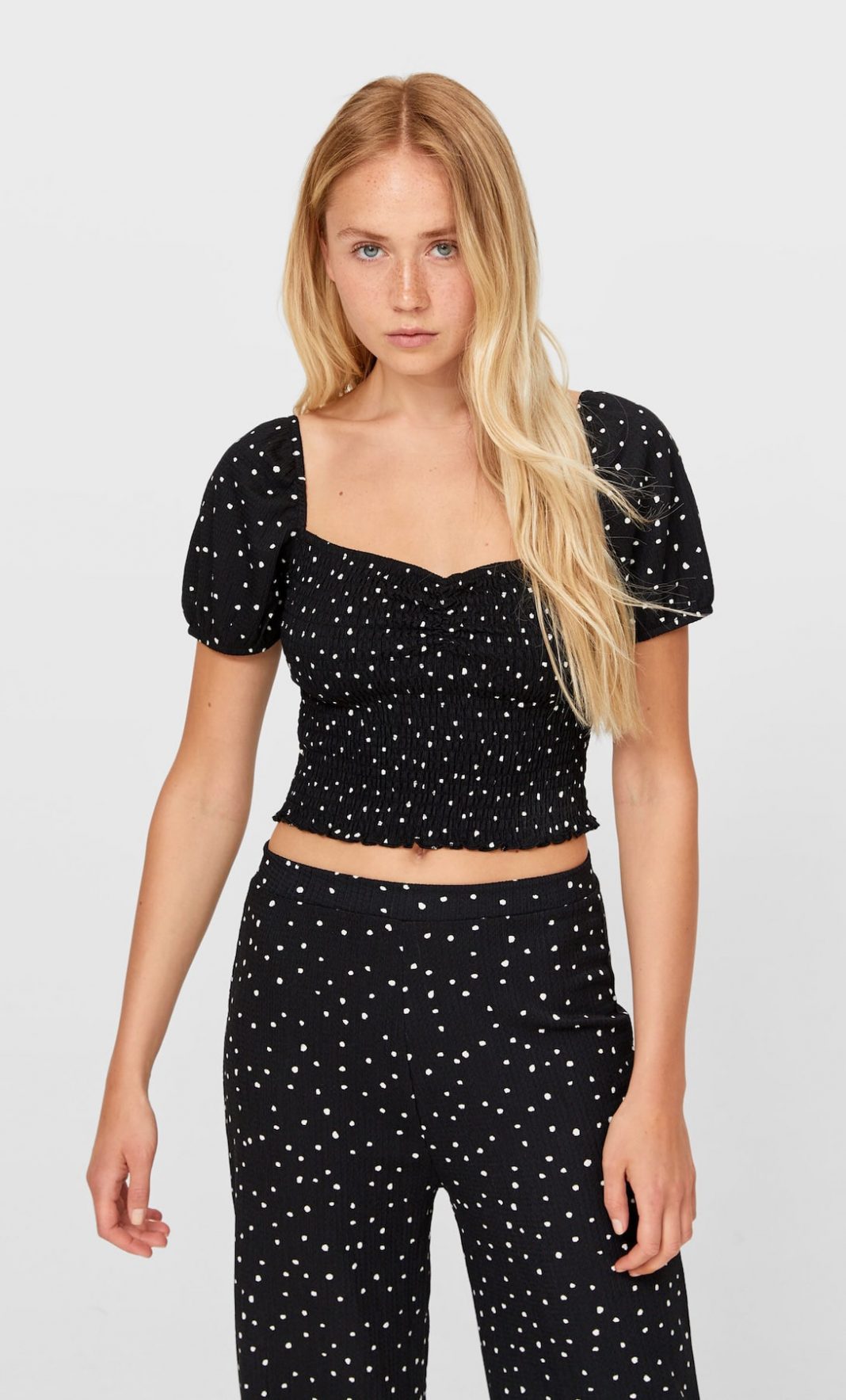 Otro top manga corta, es este top estampado gomas con un escote pico con goma y sus mangas cortas abullonada. Con elegancia manifiesta y cómodo que podrás combinar con cualquier prenda que tengas en tu vestuario.