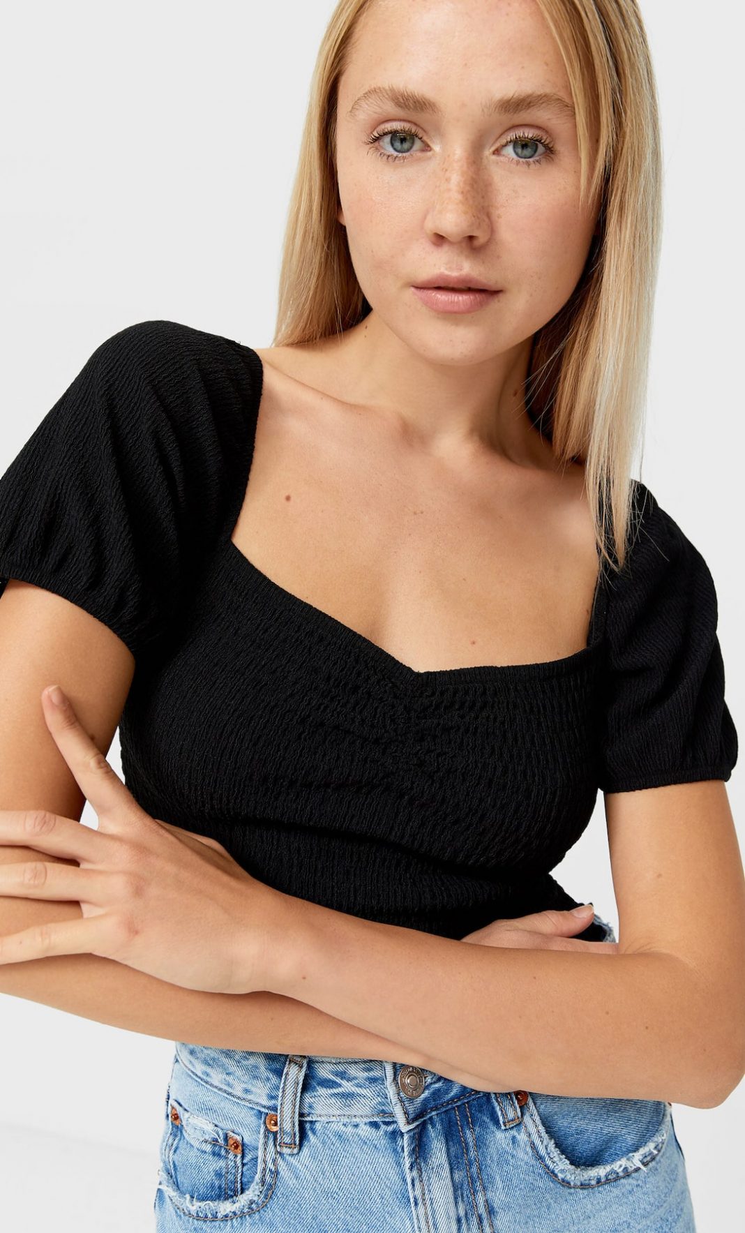 Concluimos con esta variedad de Top para este verano que les trae Stradivarius a la mujer activa de hoy. Con este top gomas diseñado con un delicado escote pico con goma y sus mangas cortas abullonadas.