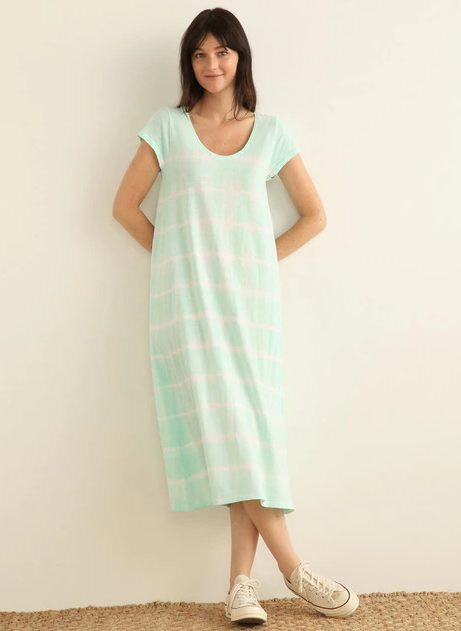 En El Corte Inglés ahora está rebajado este vestido midi de la marca Southern Cotton, confeccionado en 100% algodón disponible en dos colores diferentes, azul marino y verde agua. Tiene un corte sencillo, con una caída fluida, cuello redondo y manga corta. Con el descuento del 50% su precio se queda en 17,99€. Este es el enlace al vestido.