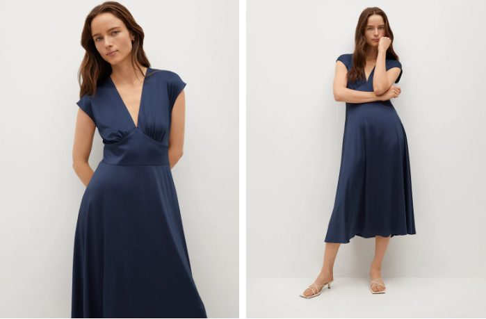 Una pieza de vestir, donde tu silueta lucirá, bajo la superficie de este vestido que posee una caída muy agradable a la vista de todos. Más formal que casual, tu elegancia y glamour te acompañarán junto a este elegante modelo. En un espectacular color, azul noche y en las tallas de la XS hasta la M. Su precio de oferta es de 19.99 euros.