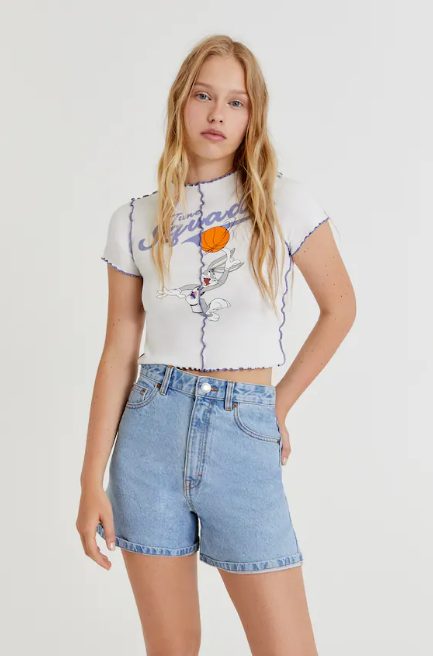 Si estás en busca de comodidad, con esta camiseta de Pull&Bear la encontrarás. La camiseta Space Jam Bugs Bunny costura, fue confeccionada para brindar comodidad y confort a la mujer activa de hoy, que se siente y quiere lucir joven. Trae una preciosa ilustración del conejo Bugs y con contraste de texto.
