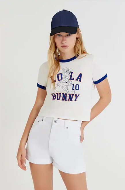 Otra pieza, cómoda y juvenil es esta camiseta Space Jam Lola Bunny, inspirada en la compañera del conejo Bugs. En su parte delantera refleja la silueta de Lola Bunny con su nombre impreso sobre la misma. De tiro corto. cuello redondo y mangas con ribetes azules.