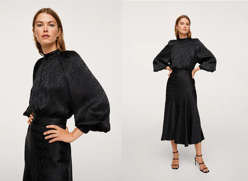 Es una blusa de tejido satinado con diseño estampado de cadenas y diseño recto. Tiene el cuello cerrado, manga larga con puños abotonados y cierre de botones en el cuello. Los botone están forrados y es una prenda que podrás combinar con otras prendas a juego como su falda midi satinada, a la venta por 39,99 euros.