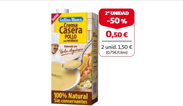 Si eres más de pollo, no puedes dejar pasar esta oportunidad en Alcampo. Con la compra de 2 unidades se aplicará un descuento del 50% en la segunda unidad, por lo que puedes tener dos bricks de crema de pollo con verduras por solo un euro. Sin duda, una ganga porque esta comida luego te puede sacar de un problema de tiempo. Además viene avalada por la cocina de Karlos Arguiñano, del que sabes que aquí somos muy fans y sabemos todas sus recetas y sus trucos de cocina.