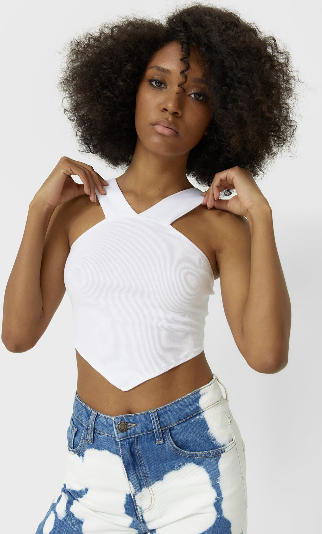 Otro de los tops que más nos gustan de Stradivarius es este con diseño de pañuelo. Llama la atención su parte de abajo, con acabado en pico, su cuello halter, uno de los más favorecedores de cara al verano, así como su impoluto color blanco.