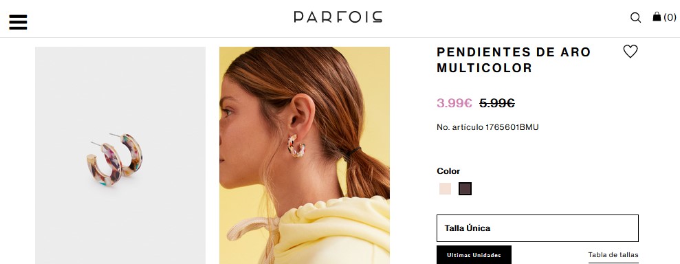 Son unos pendientes hermosos de aros multicolor que se pueden usar en cualquier momento del día. Además, son completamente perfectos por la calidad y la frescura que ofrecen en esta temporada. Están fabricados con un 30% de acrílico, un 10% de hierro y un 60% de zamak, por lo que son perfectamente resistentes de material. Cuenta con un diseño tipo luna con diferentes colores tipo colorido para darle una frescura a las mujeres que lo usen. Así que, anímate a comprar estos hermosos pendientes por Parfois a un precio accesible de 3.99€.