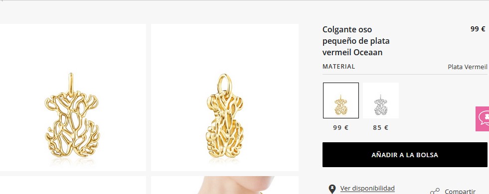 Este hermoso colgante es de plata y tiene un tamaño de oso de 22 mm, está fabricado en plata de primera ley que está recubierta de oro de 18 kt. Su espesor es de 3 a 5 micras y, además no tiene ningún otro metal entre ambos, son fabricados con una técnica de producción fundición. Cuenta con un certificado de garantía, donde se puede reflejar la plata de 1era ley 925 que es recubierta con el oro mencionado anteriormente. Si quieres comprar este hermoso colgante solo debes entrar a Tous por un precio de 99€.