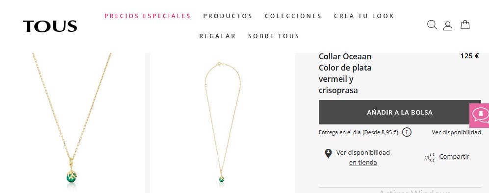Es un collar de color de plata vermeil y crisoprasa de 9mm que está sujeta por una rama en forma de coral. El collar tiene una longitud de 45 cm, con una anilla a 40 cm; es de plata de primera con ley recubierta de oro de 18 kt. Y, además tiene un espesor de 3 a 5 micras y tiene otro meter entre ambos. Son fabricado con una técnica de producción de fundición, cuenta con un certificado de garantía donde se refleja que es de plata de primera ley 925 recubierta de oro de 18 kt. Si te gusta este collar solo debes entrar a la plataforma de Tous por un precio de 125€.