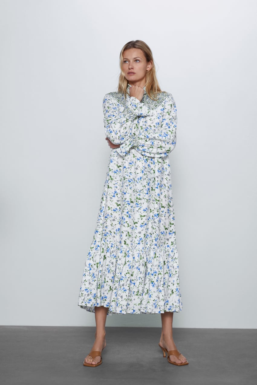 Y seguimos con la apuesta más fuerte de Zara, otro vestido midi esta vez estilo rústico también con flores. Las tonalidades, muy veraniegas, de esta prenda son el blanco, el verde y el azul. Tiene el cuello subido y rematado en elástico, que favorece mucho, ya que estiliza la figura. También las mangas acaban con elástico para formar un volante. Pero lo que realmente lo hace espectacular es el tejido nido de abeja que lleva en el pecho. ¡Corre antes de que desaparezca de las tiendas!